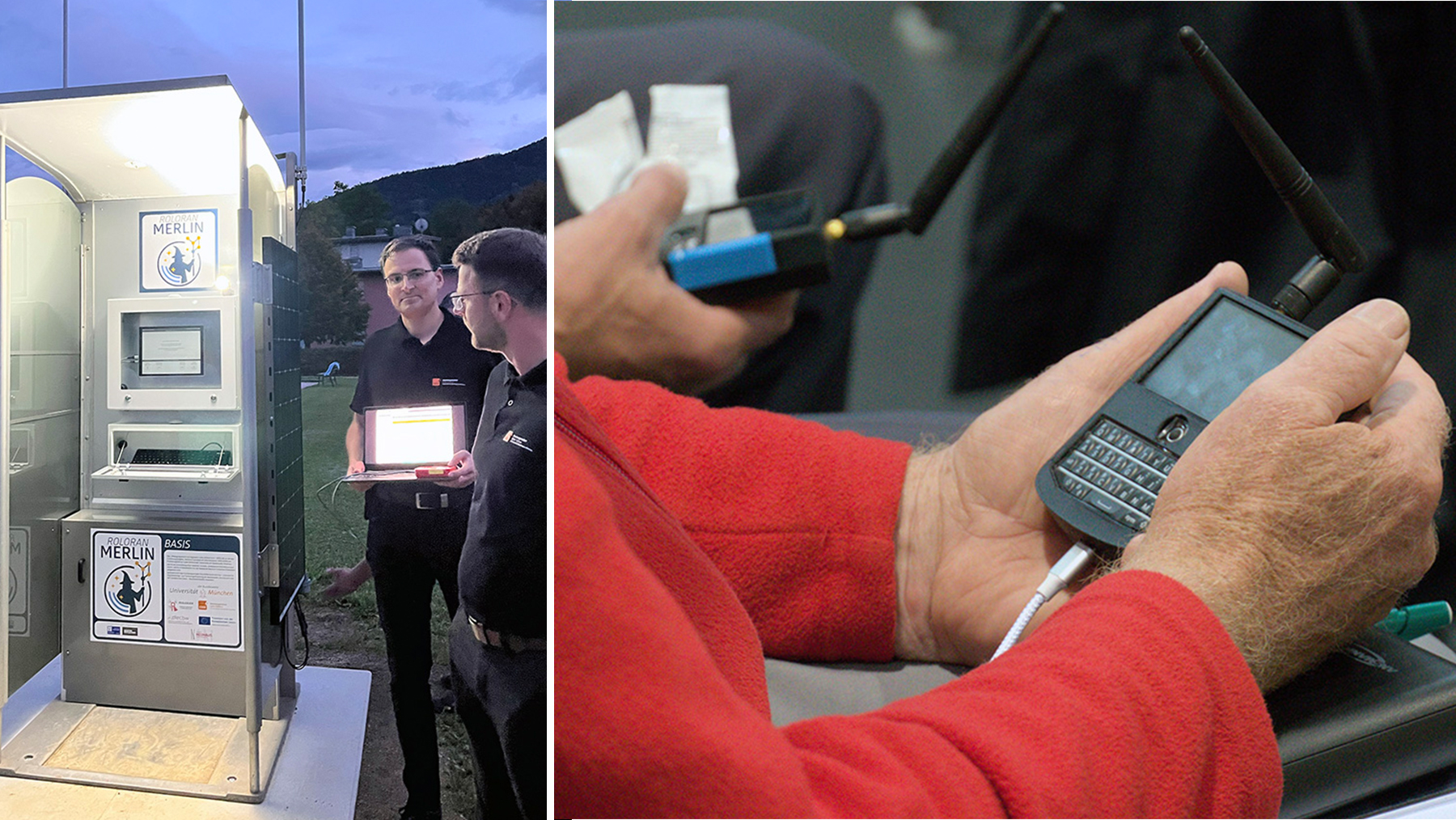 Links: MERLIN-Basisstation. Rechts:mobilen Endgeräte für Haushalte in besonders gefährdeten Ortsteilen (©UniBw M, Grabatin)